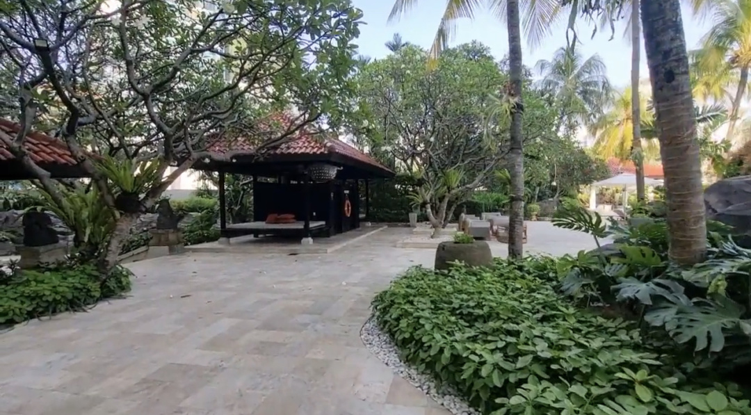 43 米长的游泳池,采用盐氯消毒,掩映于郁郁葱葱的巴厘岛花园之中