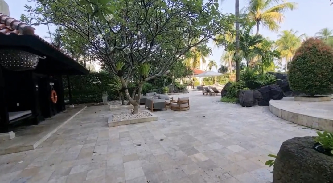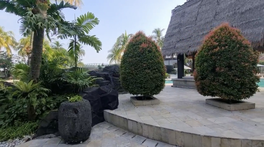 Kolam renang seluas 43 meter dengan klorin berbasis garam di tengah taman hijau bernuansa Bali