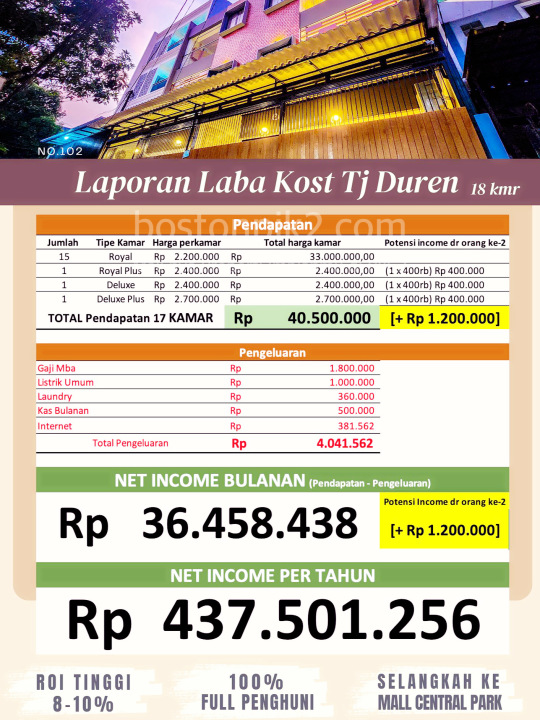 Jual Ruko Kost Tanjung Duren Timur 3 Lantai 84 m2 5,6x15 Lb 214 m2 19 Kamar - Sell Dorm Boarding House 19 Rooms Roi 10% Near Neo Soho Central Park