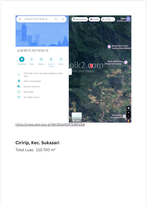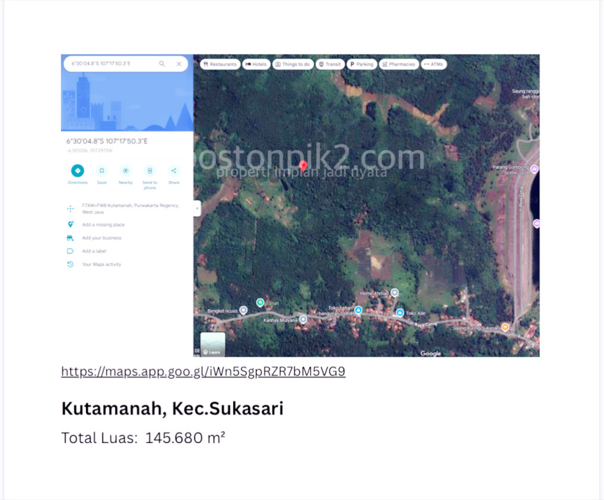 Jual Kavling Tanah 1000000 m2 100 Ha Desa Ciririp Parungbanteng Kutamanah Sukatani Sukasari Purwakarta - Sell Land 100 Ha Kutamanah Sukatani Sukasari Purwakarta