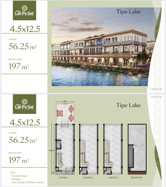 Jual Cicilan 38 Juta Rukan Ruko Lau Pa Sat Lake Hadap Danau 4,5x12,5 LT 56 m2 3,5 Lantai Kpr Express Atau Dp 0% Selama 5 Tahun