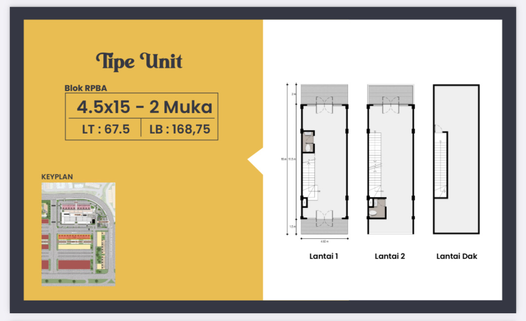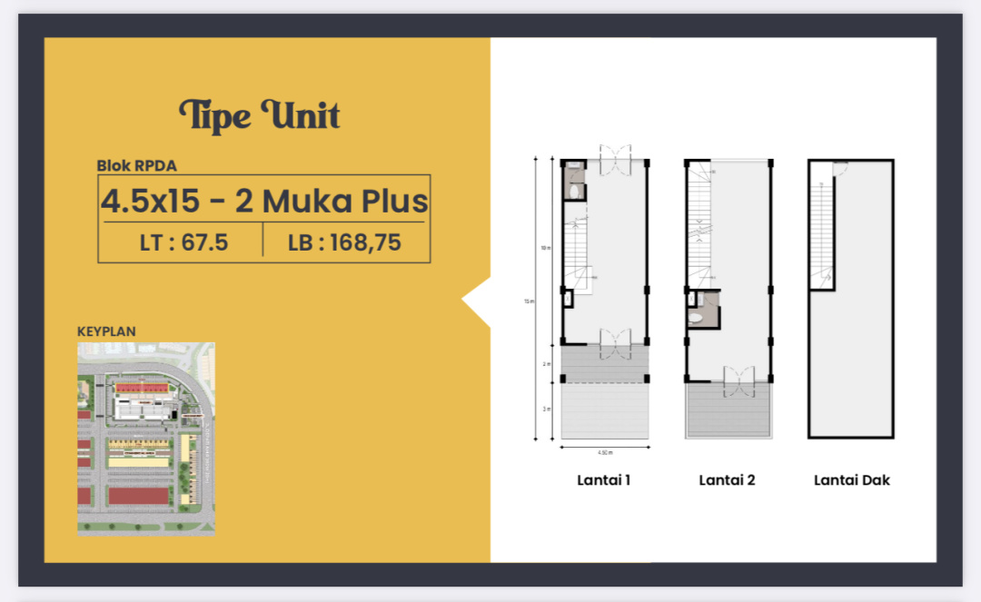 Luas Bangunan: 168,5 m2 ( 4,5x15 2 Lantai )