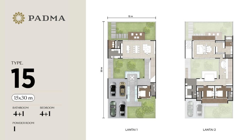 Tipe rumah 15x30 m & 15x35 m dengan 4+1 kamar tidur & kamar mandi