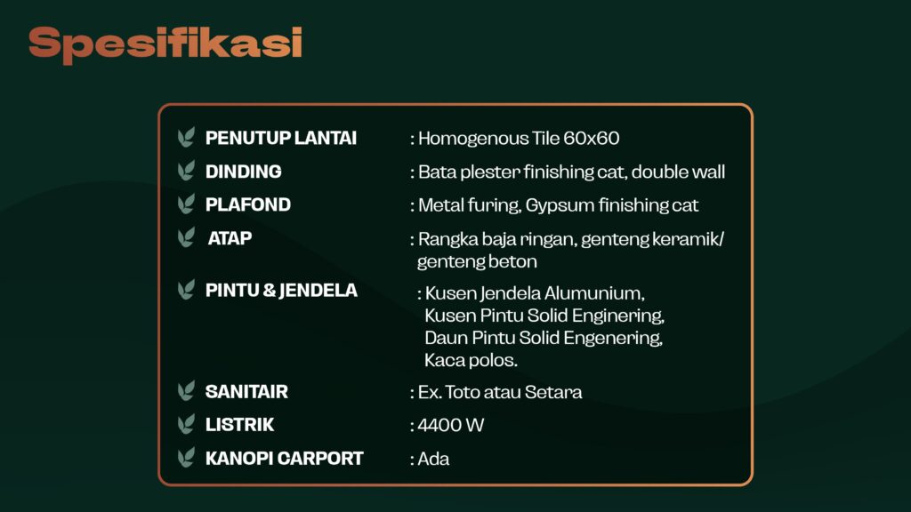 - Atap: Rangka baja ringan, genteng beton/keramik