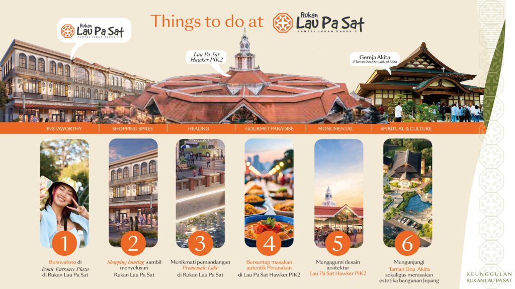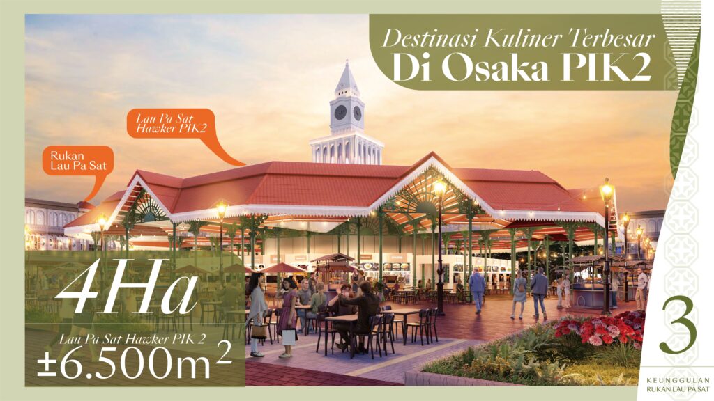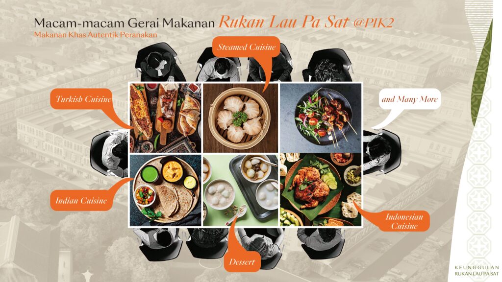Rukan Lau Pa Sat PIK2 menghadirkan pusat kuliner dan bisnis dengan konsep tematik Peranakan yang terinspirasi dari Lau Pa Sat Hawker Centre, ikon kuliner legendaris di Singapura. Berlokasi strategis di jantung pengembangan Pantai Indah Kapuk 2 (PIK2), kawasan ini memadukan arsitektur kolonial Eropa & Singapura dengan suasana kuliner autentik dari berbagai negara seperti Indonesia, Melayu, China, Turki, India hingga pilihan vegetarian.