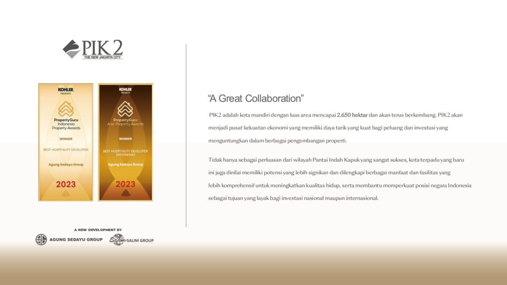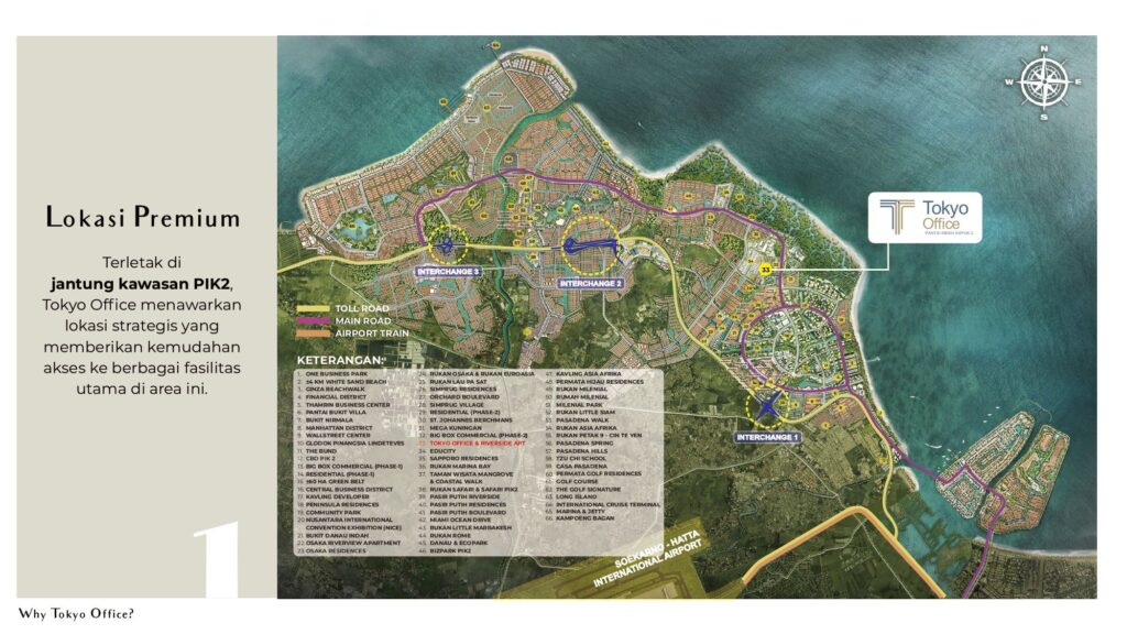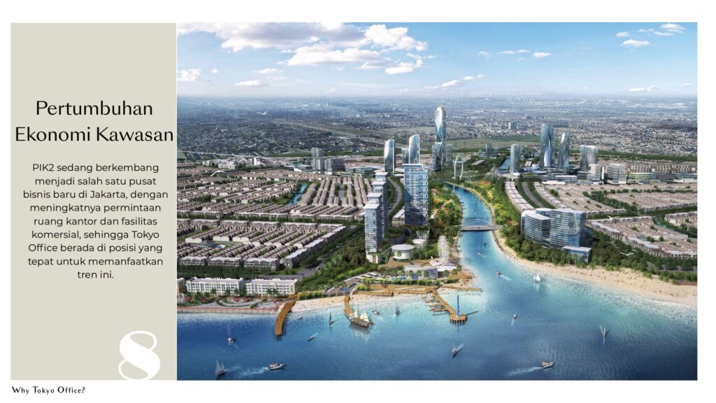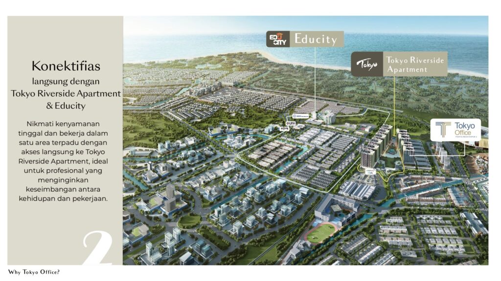 Tokyo Office Kyoto Tower merupakan bagian dari mega-proyek PIK2 Sedayu Indo City, kawasan kota mandiri seluas 2.650 hektar yang mengusung konsep Smart City dengan fasilitas modern, infrastruktur transportasi terintegrasi, dan akses langsung hanya 7 menit dari Bandara Soekarno–Hatta.