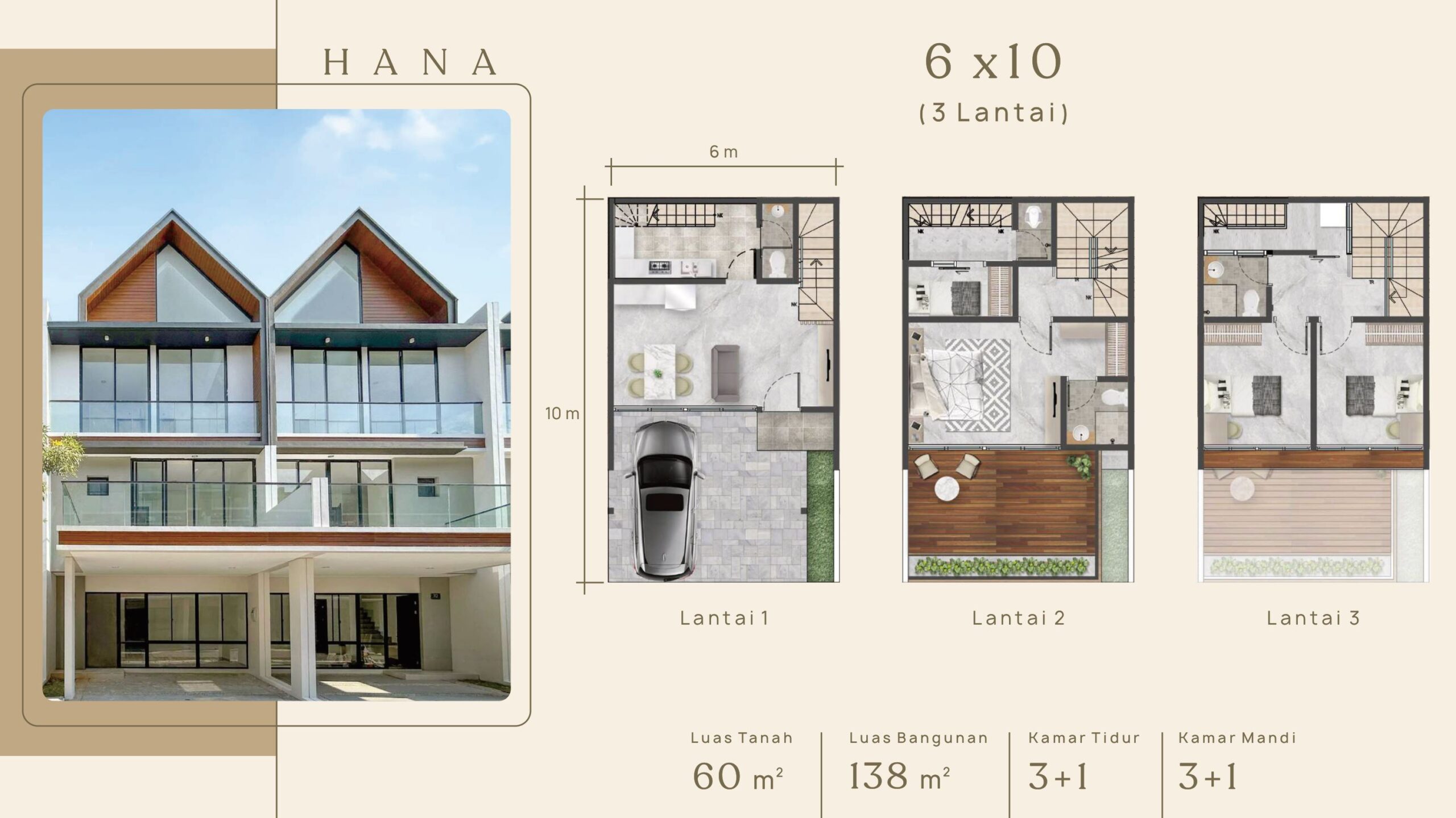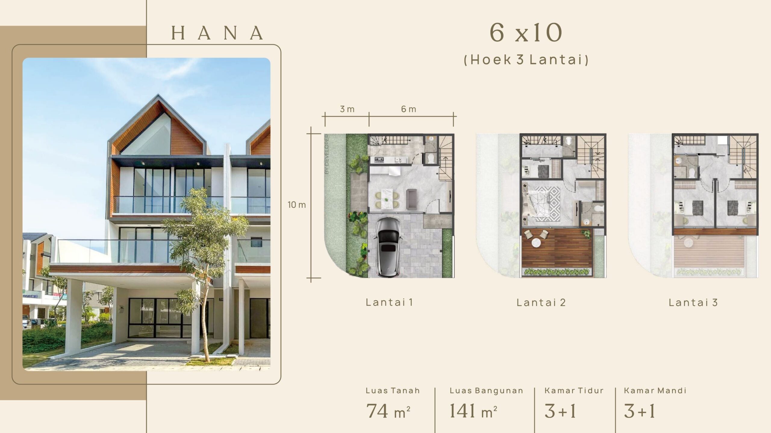 • Tipe Hana (6x10, 3 Lantai / Hook) – LT 60–74 m² | LB 138–141 m² | 3+1 KT | 3+1 KM